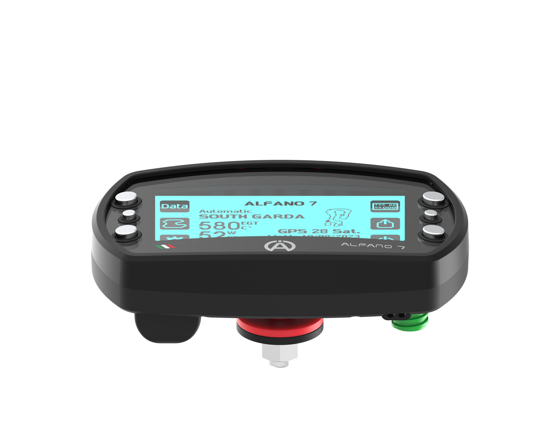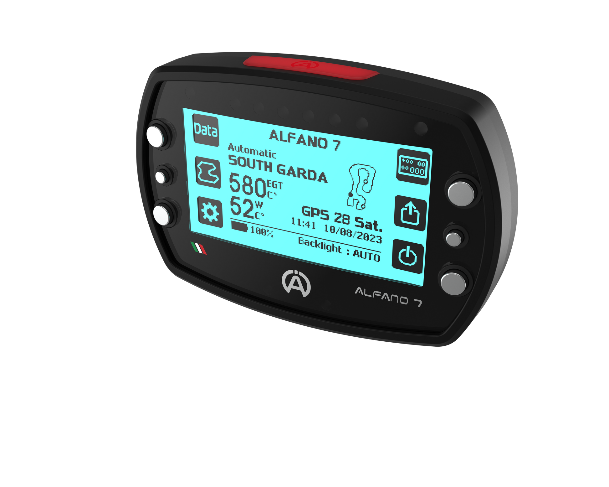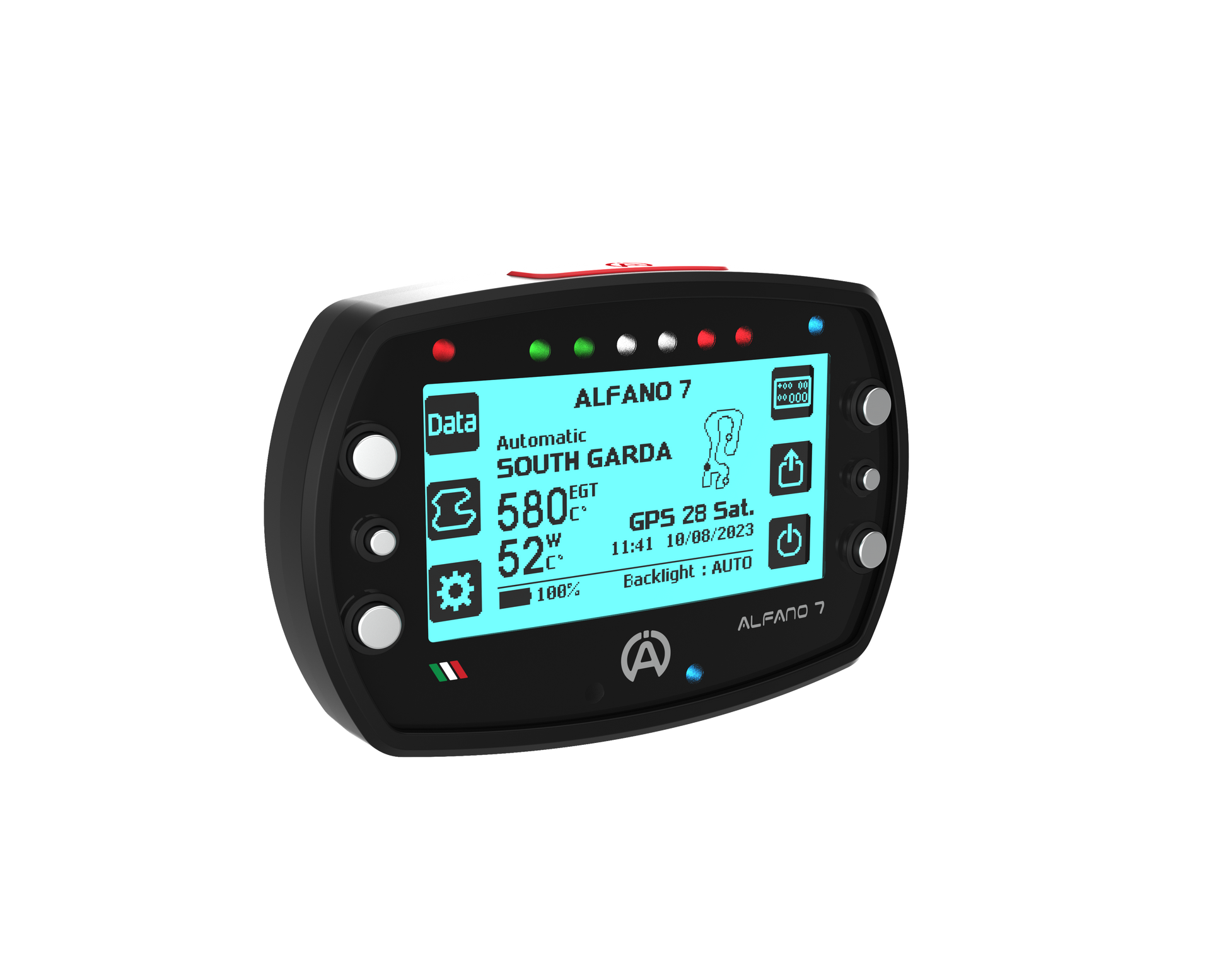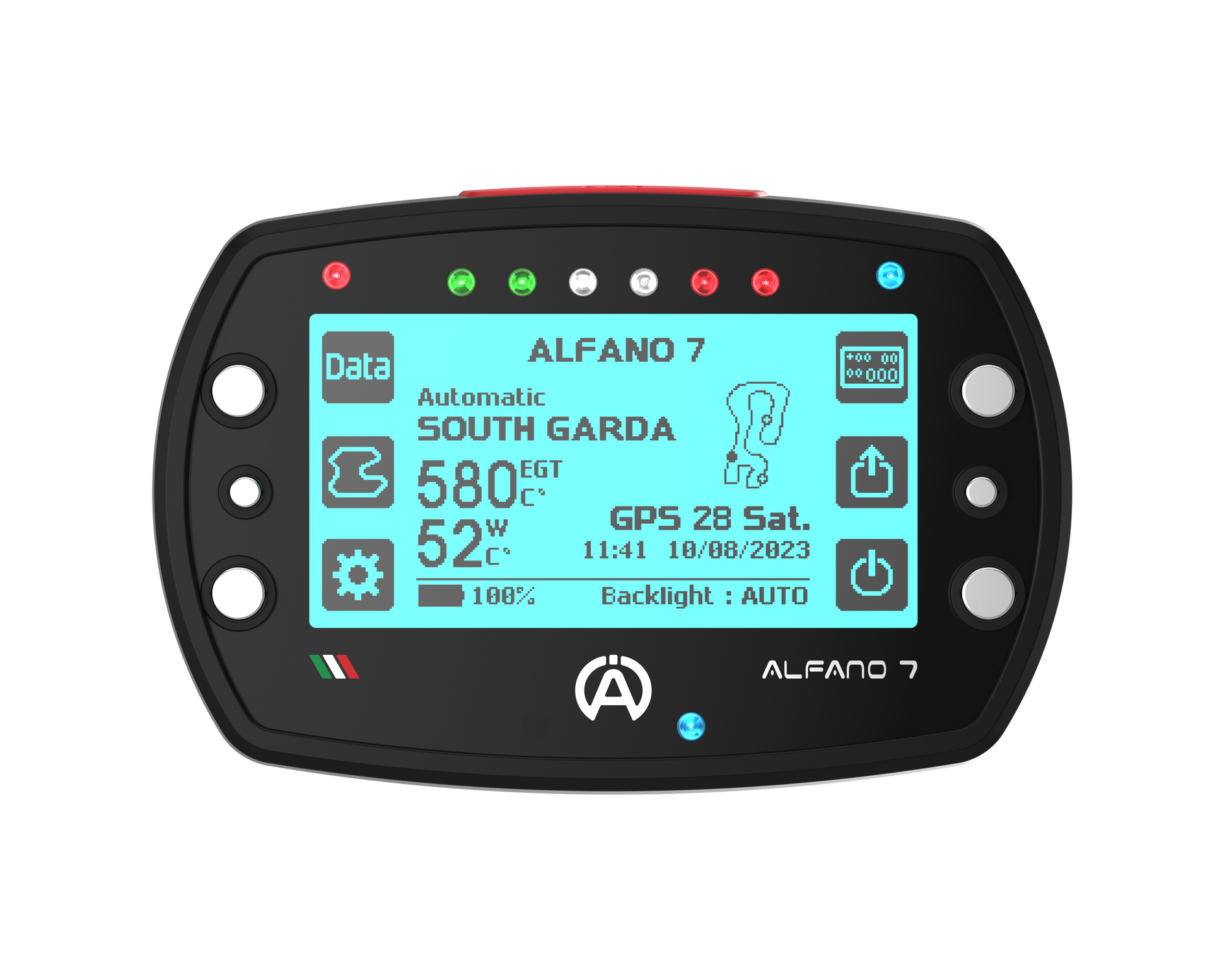 The Alfano 7 has a latest-generation GPS module with 25 Hz, in which it works with the satellites from Navstar US, Glonass RU, BeiDou CHN and Galileo EU. Over 5525 Tracks / Circuits are available via GPS. The speed can be measured via GPS or a speed sensor.