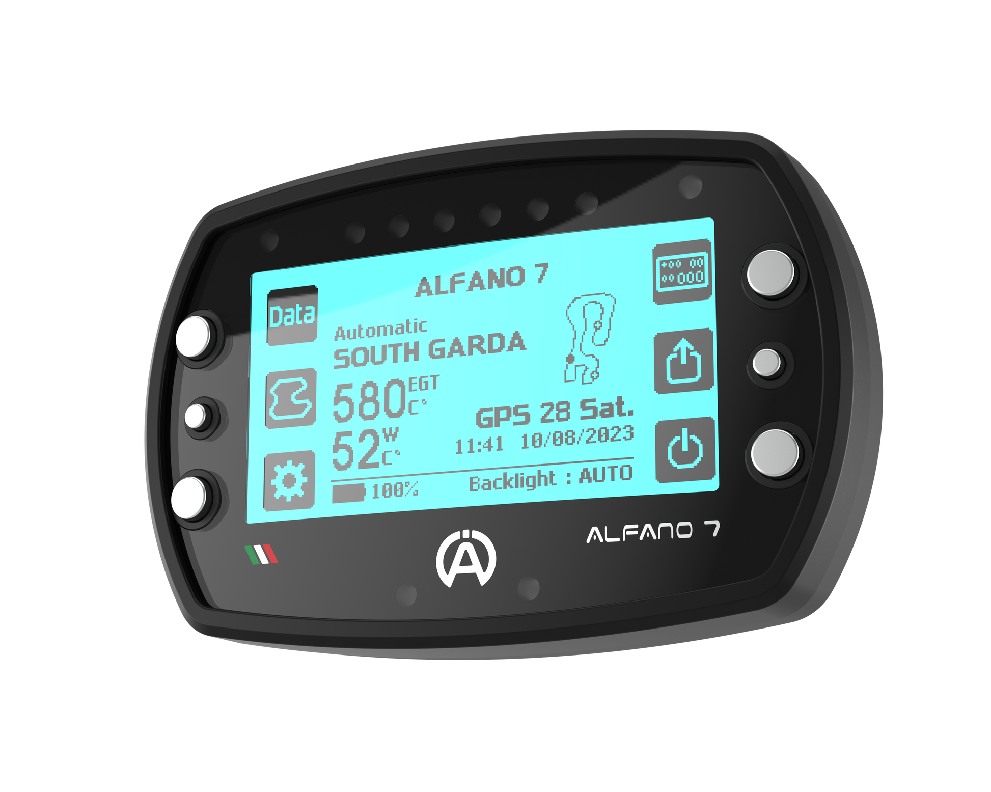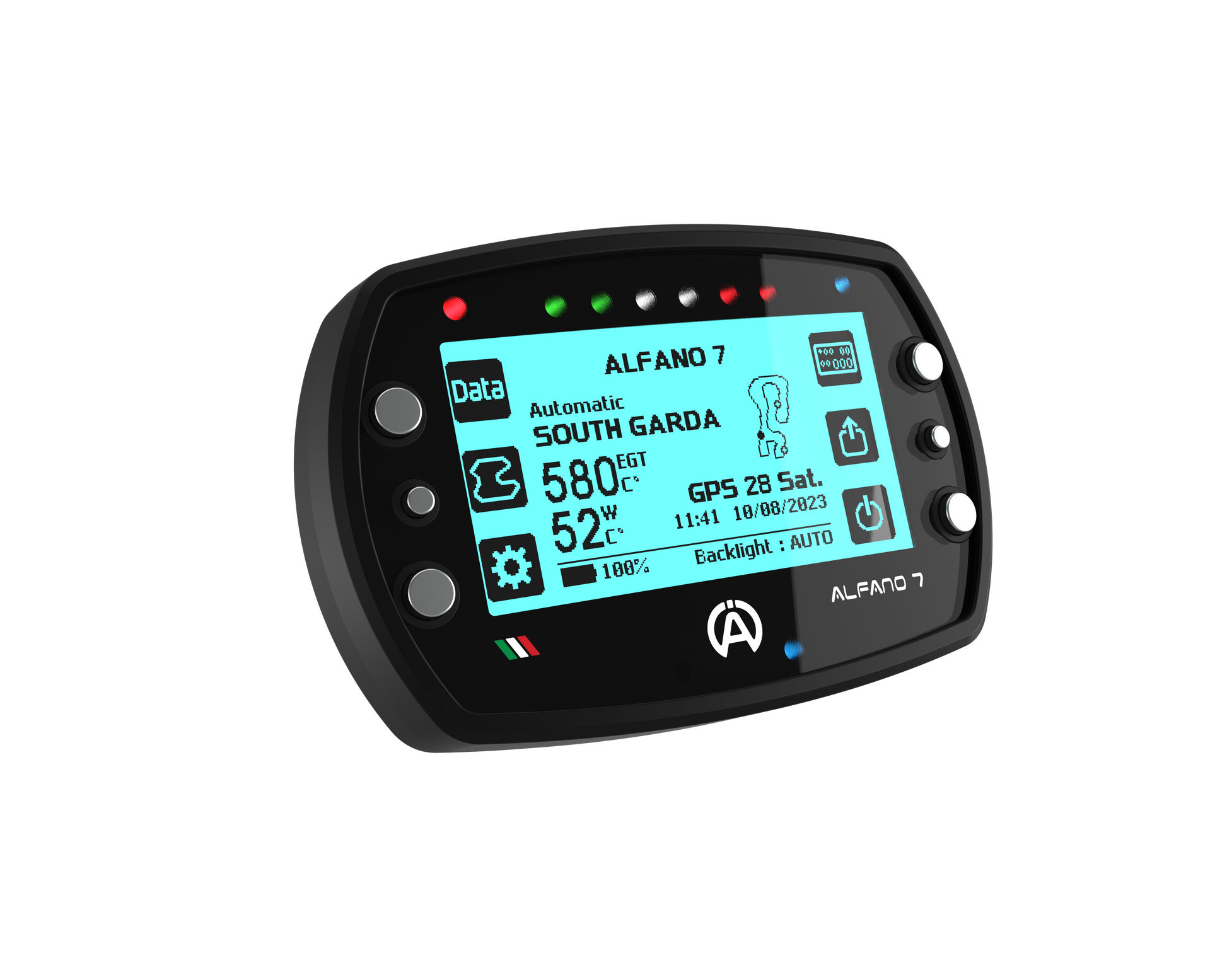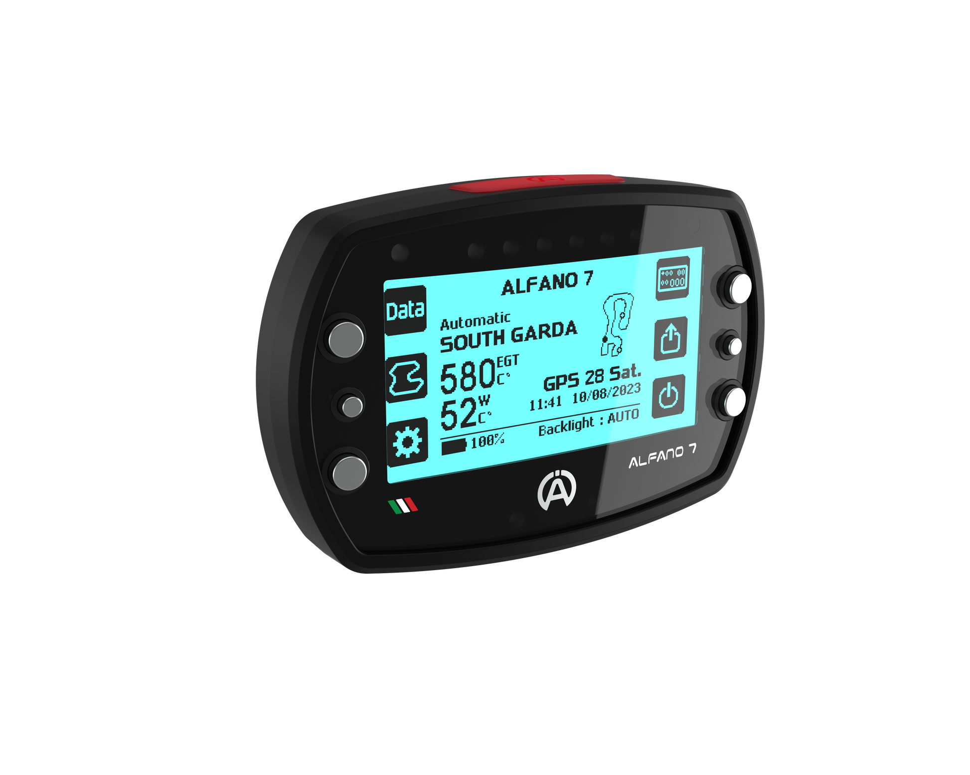 The Alfano 7 has a latest-generation GPS module with 25 Hz, in which it works with the satellites from Navstar US, Glonass RU, BeiDou CHN and Galileo EU. Over 5525 Tracks / Circuits are available via GPS. The speed can be measured via GPS or a speed sensor.