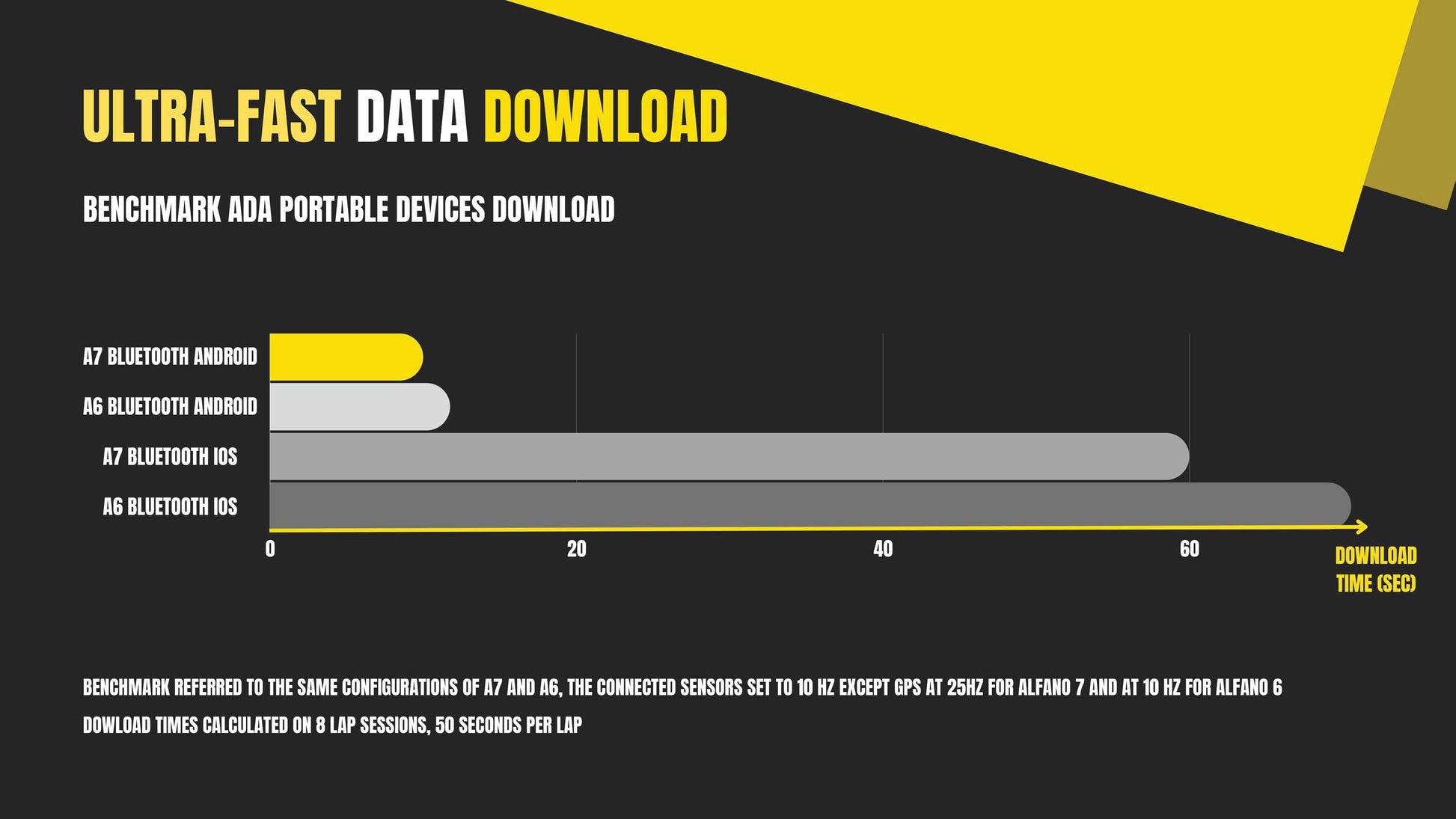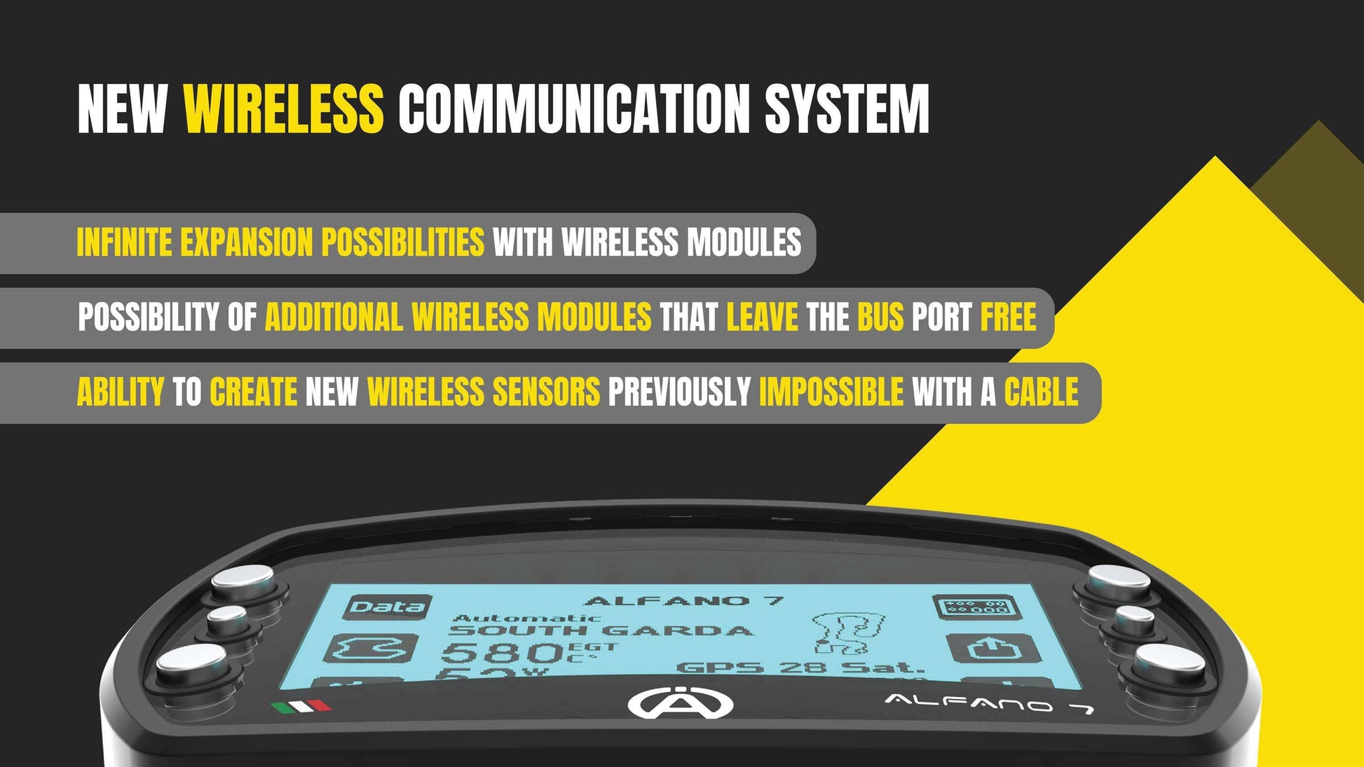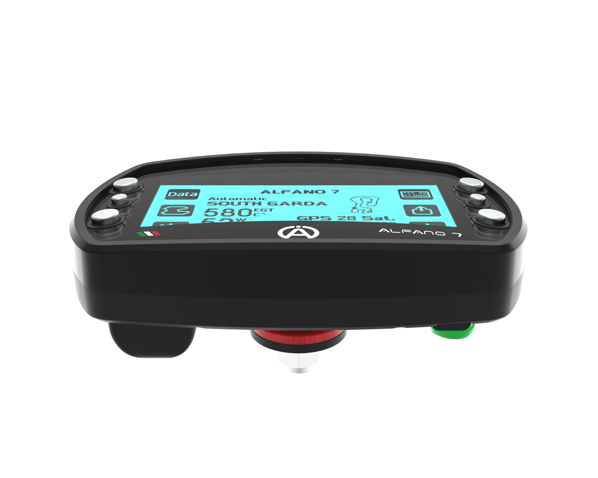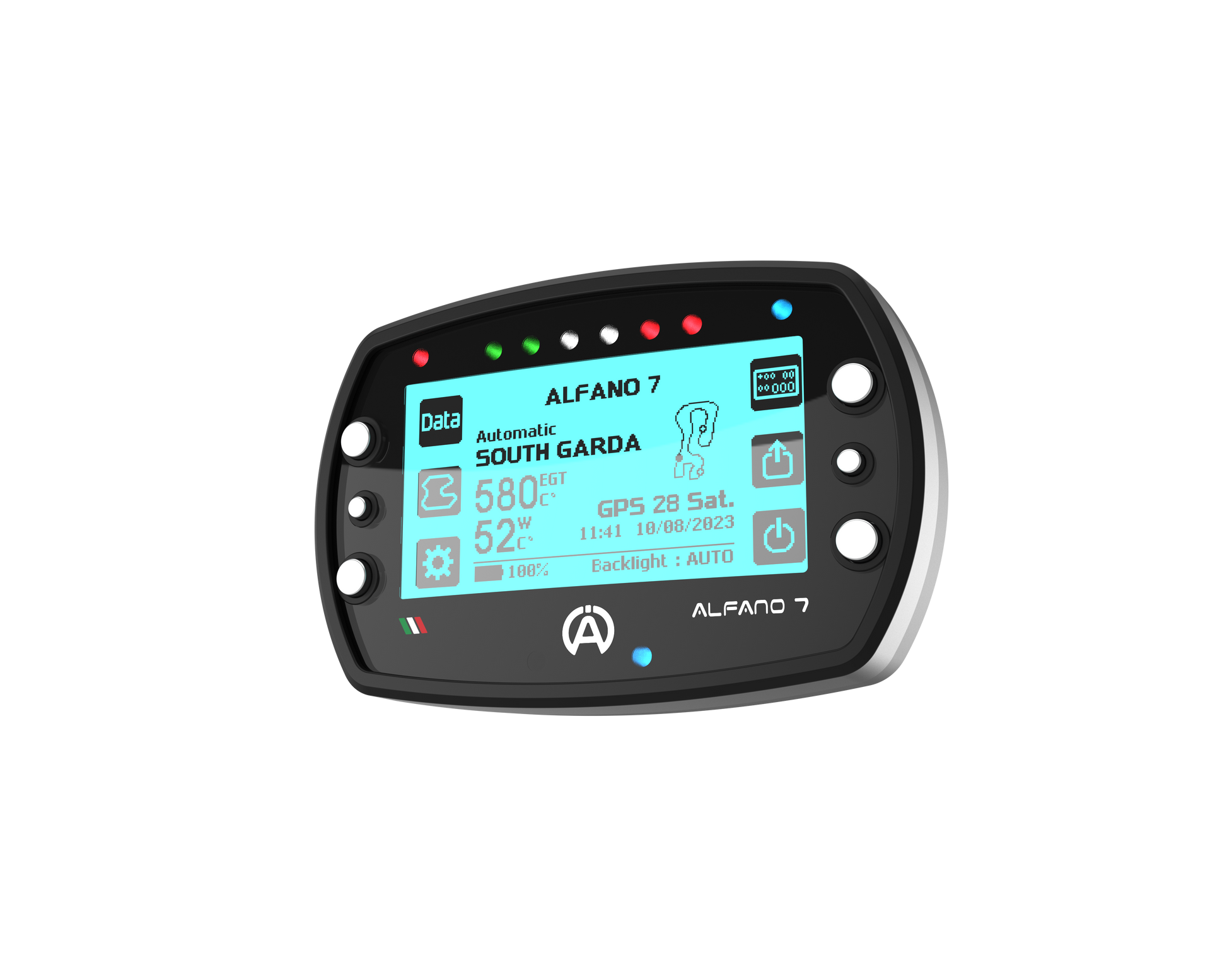 The Alfano 7 has a latest-generation GPS module with 25 Hz, in which it works with the satellites from Navstar US, Glonass RU, BeiDou CHN and Galileo EU. Over 5525 Tracks / Circuits are available via GPS. The speed can be measured via GPS or a speed sensor.