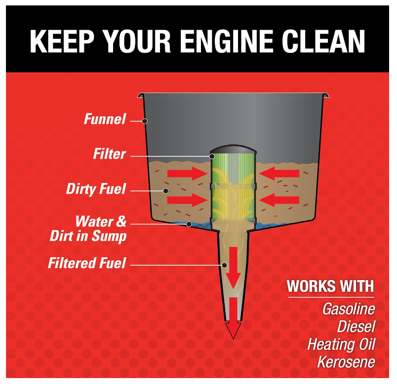 The Mr Funnel is a heavy duty, anti-static and fast flow funnel with built-in filter technology. When fuel is poured through the funnel water and debris will not pass through the filter's flouropolymer-coated stainless steel filter. Therefore, only filtered fuel goes into your engine improving efficiency, durability and proper operation. The filter is easily cleaned with no replacement parts.