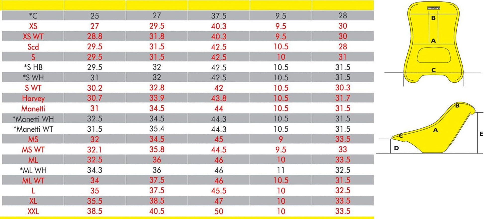 The T11 size range is large and includes many sizes in a "WT” wide top version. These help correctly fit drivers who either have narrow hips and a wide chest or use a very thick rib protector, such as the protectors we make bespoke on individual drivers.